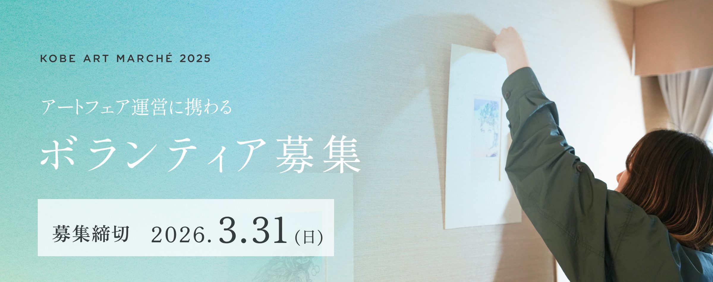 2026年5月22日(金)〜24日(日) (設営:21日(木) / 撤去 25日(月) )にて開催する「KOBE ART MARCHÉ 2026」の当日運営ボランティアスタッフを募集いたします。KOBE ART MARCHÉはアートギャラリーが一堂に会し、美術作品を販売するイベントです。アートがお好きな方、アート業界に興味のある方、アートイベントの運営に携わった経験のある方など、ぜひご応募くださいませ。初めての方も大歓迎です。
