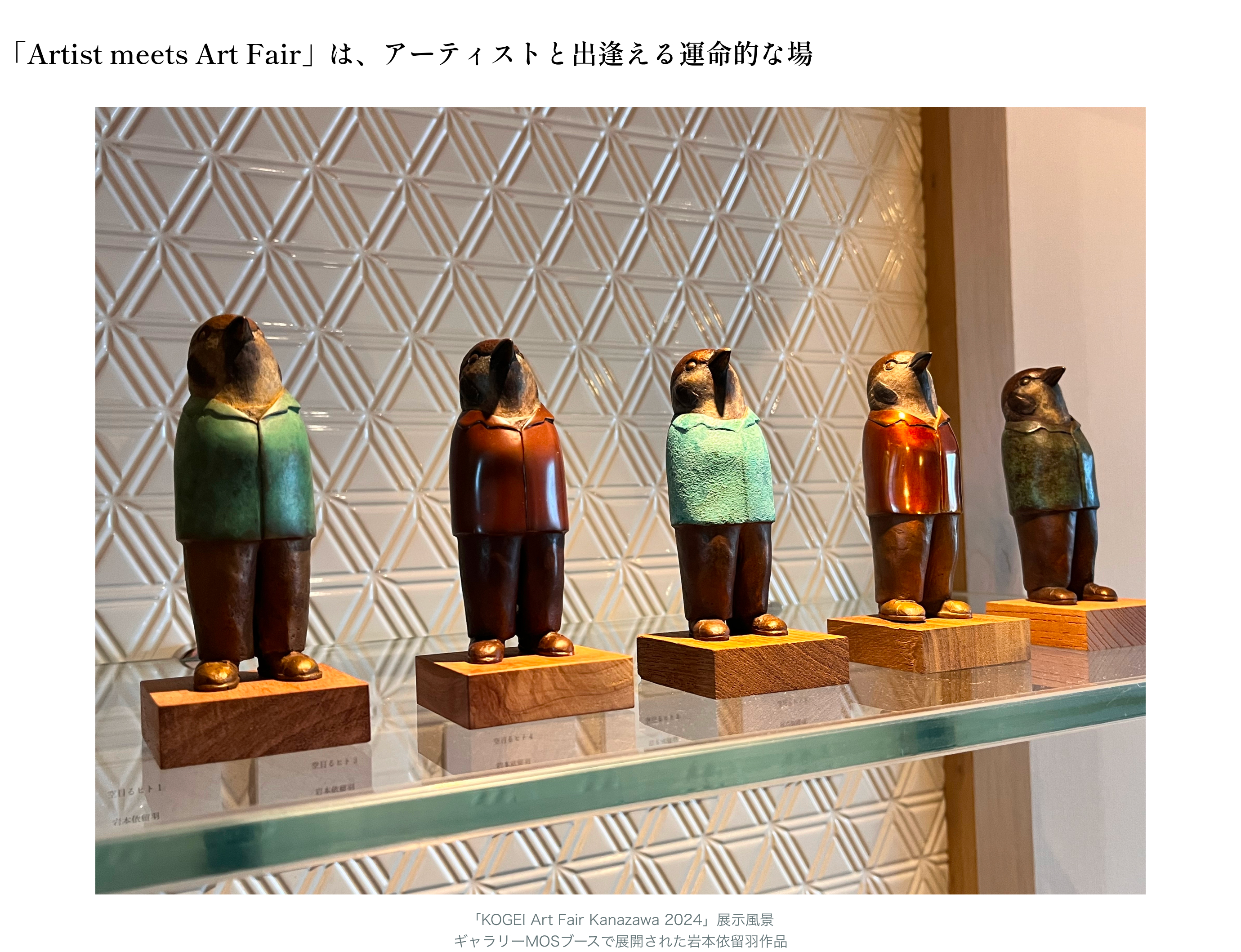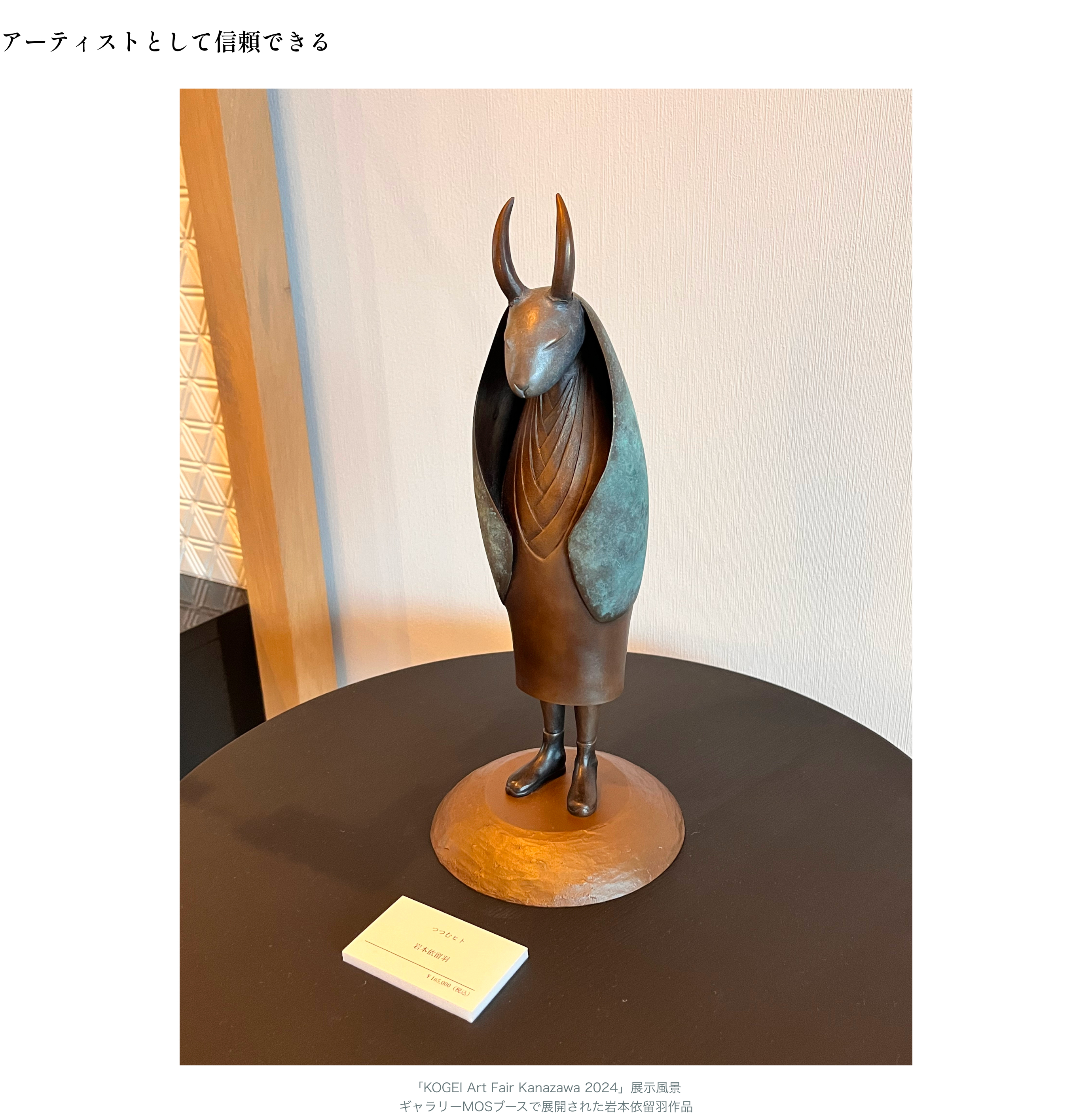 その日は岩本さんと4、5時間程一緒にいましたが、神戸以来でほぼ初対面なのに会話をしていて信頼できる感覚がありました。私の中でアートフェアでアーティストを紹介するのは、ギャラリーで展示した上で納得してからと考えていますが、岩本さんはアートフェアに作品を出してもいい方だと直感的に確信しました。それで帰り際に金沢のアートフェア(「KOGEI Art Fair Kanazawa 2024」)にお誘いしました。